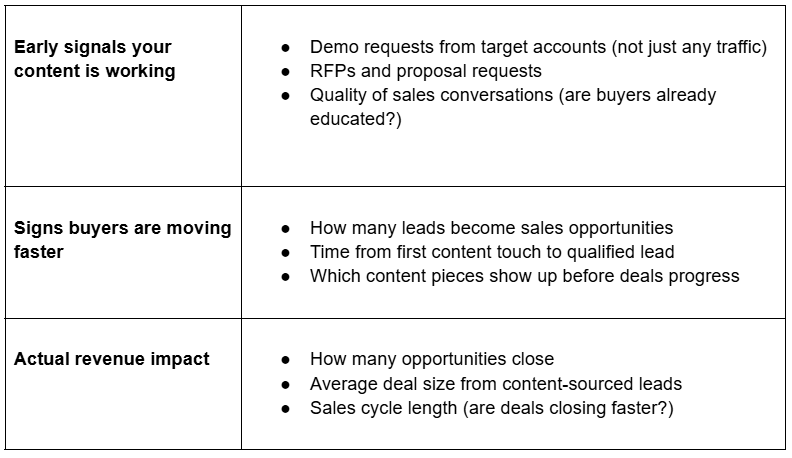 A successful content strategy shows up in more informed buyers, less re-explanation, and faster time from evaluation to sale. Traditional content metrics like website traffic and post engagement fall short because they measure activity, not impact.