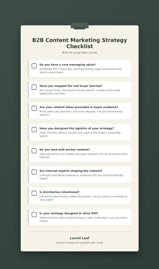 Our B2B content marketing strategy checklist gives you a systematic approach to building a foundation that supports your GTM motion. It’s designed for marketing leaders at B2B SaaS, AI, and tech companies who need a content engine that supports long sales cycles and drives measurable pipeline impact.