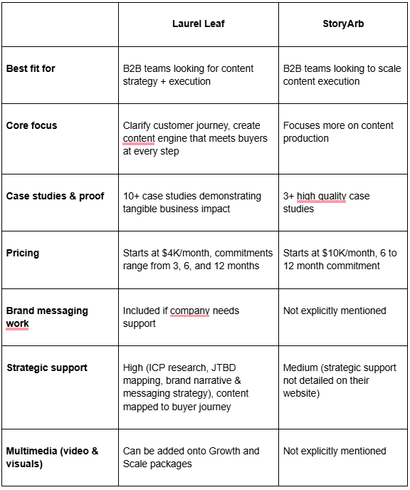 Quick verdict: Laurel Leaf costs 60% less, includes content mapped to the buyer journey, and shares 10+ documented case studies. StoryArb excels at high-volume production for teams with clearly defined positioning.
