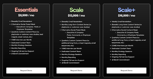 Storyarb’s packages include regular newsletter and weekly social post support, quarterly long-form content, a dedicated content team, monthly strategy sessions and reporting. Their services require an annual investment of approximately $119,988 (Essentials) to $203,988 (Scale+).