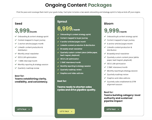Ongoing content packages start at 4K EUR/USD per month and include an anchor piece driven by unique insights, along with LinkedIn and newsletter support, quarterly reporting and strategy sessions.